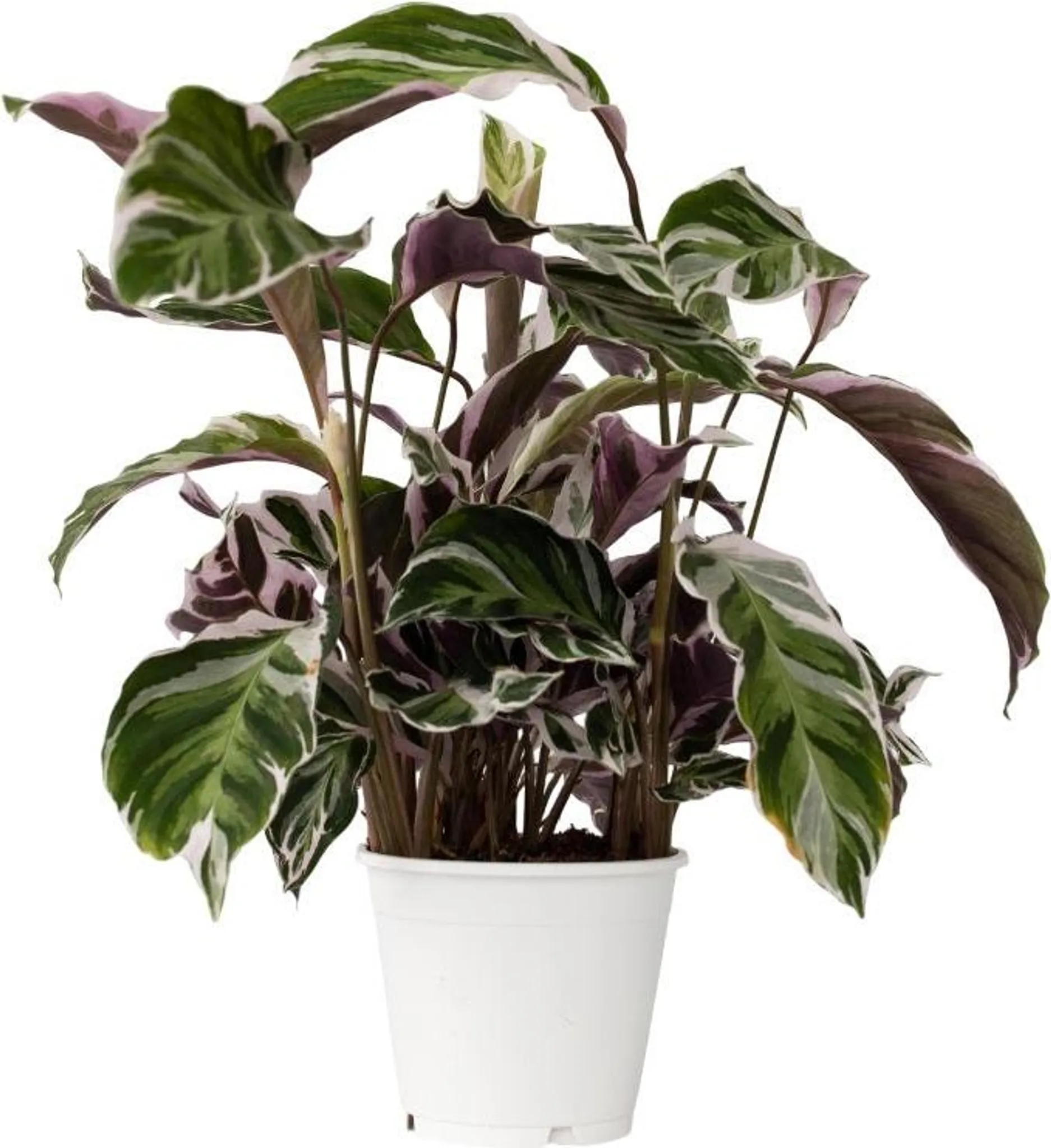 Die Calathea Fusion White ist eine besonders elegante und exklusive Zimmerpflanze mit weiss-grün marmorierten Blättern und einer zart violetten Blattunterseite. Jedes Blatt ist individuell gemustert, was diese Korbmarante zu einem echten Kunstwerk der Natur macht.
