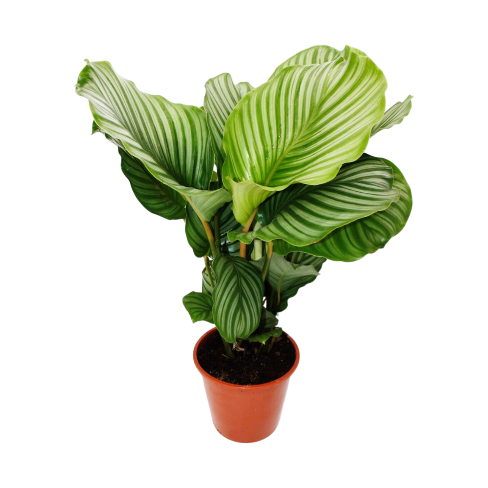 Die Calathea orbifolia ist eine luxuriöse tropische Statement-Pflanze mit riesigen, elegant gestreiften Blättern. Sie eignet sich ideal für alle, die eindrucksvolles, haustierfreundliches Zimmergrün mit starker Dschungelwirkung suchen.