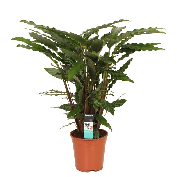 Die Calathea rufibarba ist eine elegante und zugleich besondere Korbmarante mit schmalen, gewellten Blättern in sattem Grün. Die Blattunterseiten und Stiele sind mit einem feinen, samtartigen Flaum überzogen, was ihr ein sehr weiches, natürliches Erscheinungsbild verleiht.