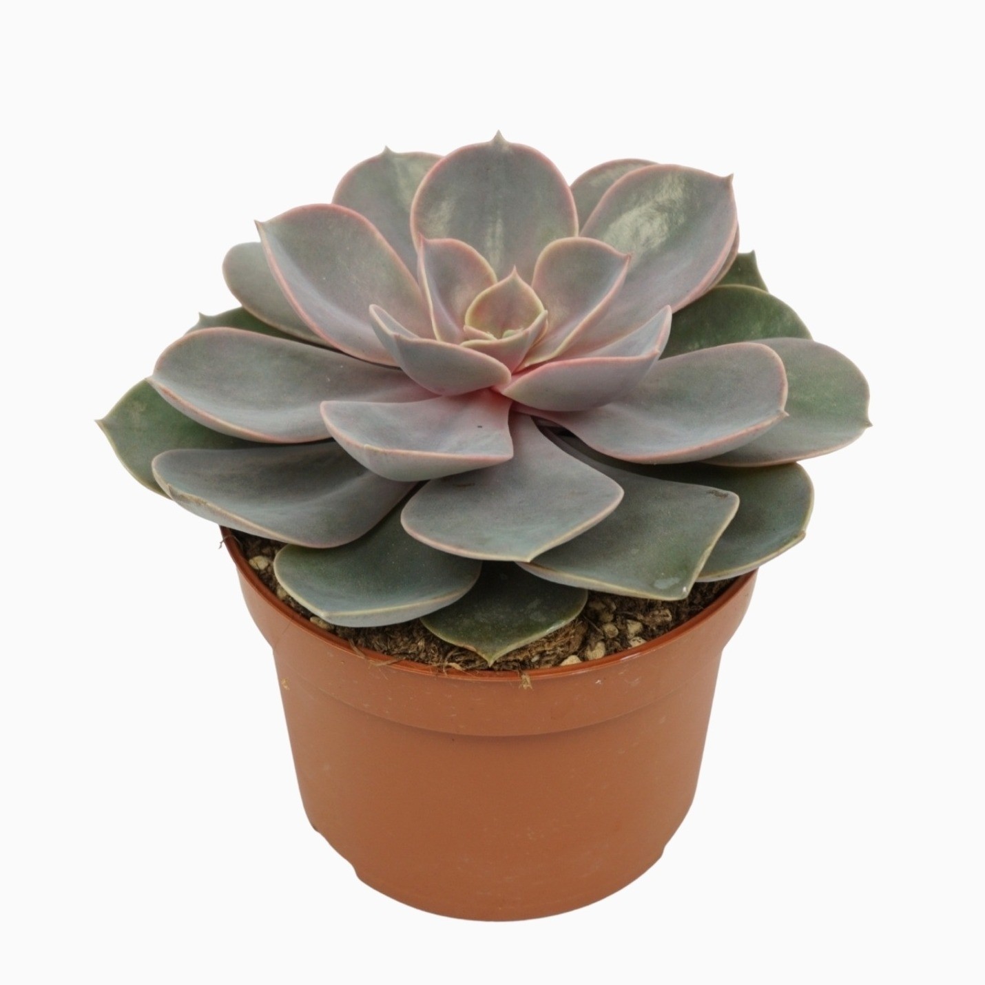 Die Echeveria Perle von Nurnberg ist eine der bekanntesten Designer-Sukkulenten mit perfekt symmetrischer Rosette und pudrig violett-rosa bis silbrig-lilafarbenen Blättern. Die sanfte Farbgebung verändert sich je nach Lichtintensität und macht jede Pflanze einzigartig. Durch ihren eleganten, kompakten Wuchs eignet sie sich ideal für Fensterbänke, moderne Pflanzgefässe oder hochwertige Sukkulenten-Arrangements.