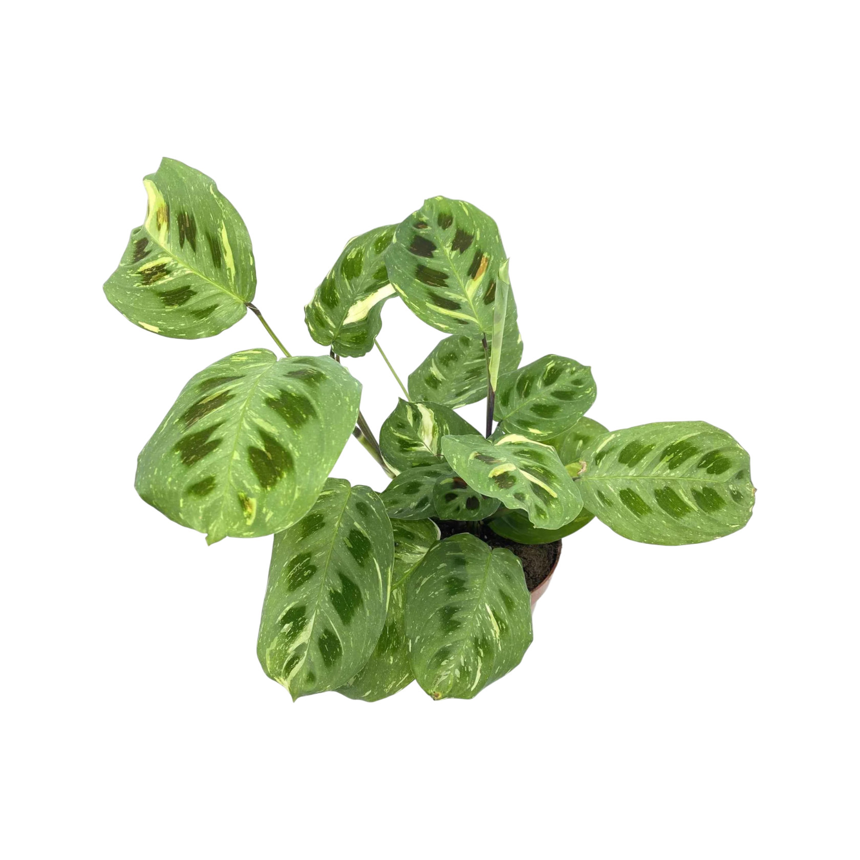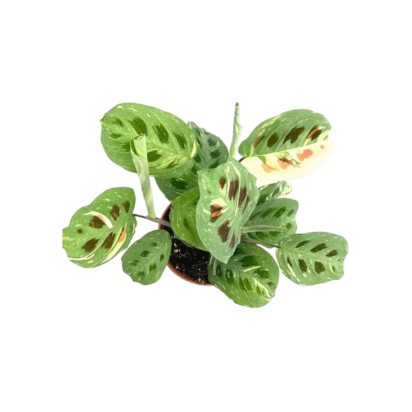 Die Maranta leuconeura kerchoveana variegata ist eine besonders dekorative Zimmerpflanze mit hellgrün bis cremefarben panaschierten Blättern und typischen dunklen Flecken. Jede Pflanze zeigt ein individuelles Farbspiel, wodurch sie besonders bei Sammlern und Liebhabern variegierter Pflanzen beliebt ist. Wie alle Gebetspflanzen bewegt sie ihre Blätter im Tagesverlauf und richtet sie abends leicht auf. Dank ihres kompakten, buschigen Wuchses eignet sie sich ideal für Wohnräume, Regale oder dekorative Pflanzengruppen.