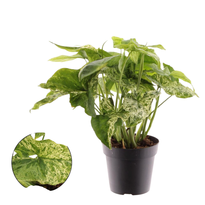 Das Syngonium podophyllum Mottled ist eine dekorative und moderne Purpurtute mit pfeilförmigen Blättern, die von einer unregelmässigen hellgrün bis cremefarbenen Sprenkelung durchzogen sind. Jedes Blatt ist individuell gemustert, was der Pflanze ein lebendiges und natürliches Erscheinungsbild verleiht.